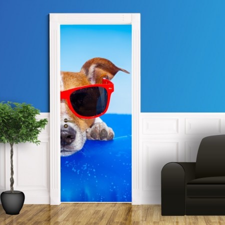 adesivo per porta - rivestimento per porta - decorazione per porta - raffigurante un cane con occhiali realizzato in stampa digitale plastificata, lavabile, ottima adesività su qualunque tipo di superficie, (superfici piane, semicurve e curve).